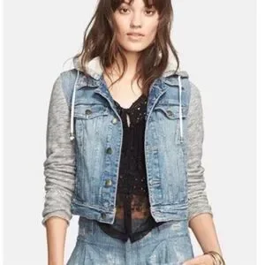 Distressed denim/knit jacket with gray sleeves. Features a cozy hood. Ideal for layering.