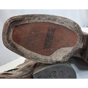Distressed tan leather boots boast black sequin wing & cross inlays on vamp & shaft