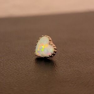 White opal heart in white gold setting. The warm lighting makes it look more like yellow gold in the photos, but it is white gold. Threadless post, bent slightly for tension.