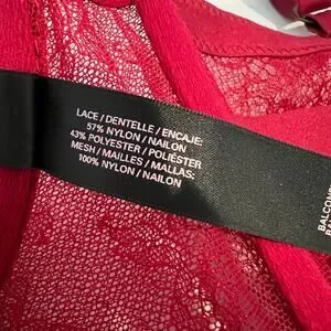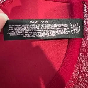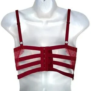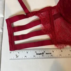 Victoria’s Secret strappy red lace balconette bra size 32C. Long line / corset style. Padded for a push up effect.