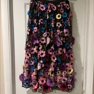 Vibrant 3D floral skirt with a black base. Features colorful flowers in pink, purple, blue, and red.