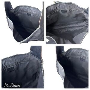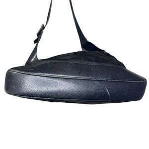 Silver-tone hardware, Black canvas with black leather trim, Single adjustable shoulder strap, Black fabric lining with one internal zipped pocket, Piston-lock closure.