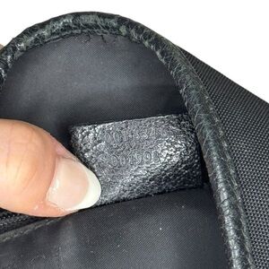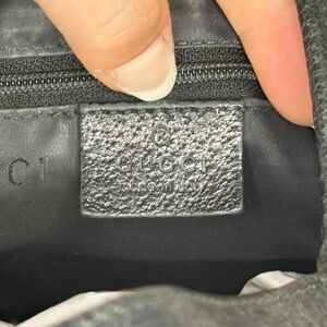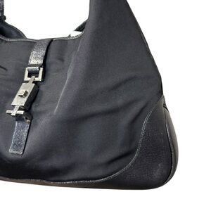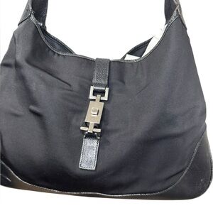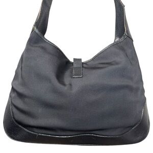 Vintage Gucci Jackie Black Handbag in good preowned condition with signs of wear such as, scuffing on leather edges, minor discoloration/stains on canvas material, scratching on logo clasp closure, wear on handle and trim. Minor tearing around the edges of the top of the bag. Please see all photos for accurate description and condition. Interior is pretty clean. Bag is still in good condition and has lots of life left. Comes from a smoke free home!