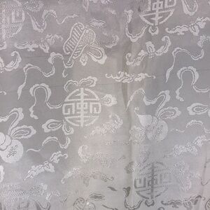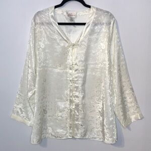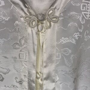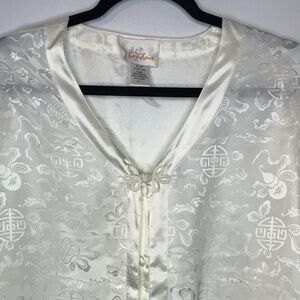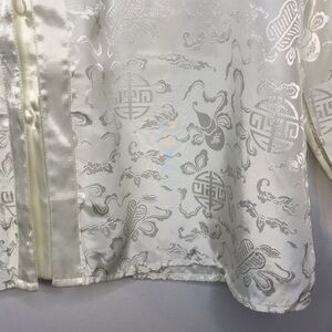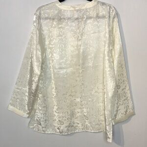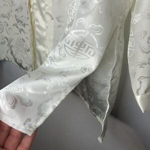 In good vintage condition. Pretty hidden buttons with knotted first button. Asian inspired printed sheen fabric. Slits on the side. Measure lay flat: shoulder 18,5’’ bust 24’’ length 29’’ sleeve length 23’’. Off white color.