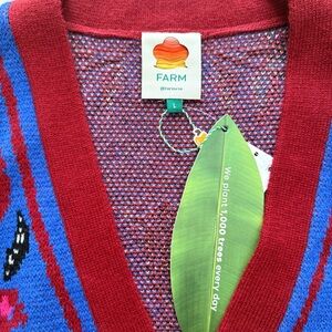 FARM Rio Palms Paradise Print Jacquard Knit Cardigan. In a blue base color, with red accent. Size L. NWT.