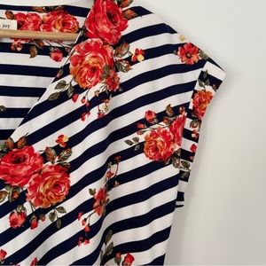 FAITH & JOY BY MONTEAU NAVY/WHITE STRIPED WITH RED FLORAL VNECK TIE TOP, MED