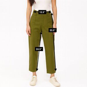 Chic and versatile olive green high-rise pants with a straight-leg fit and subtle front seam detailing. Made from soft, breathable cotton with just the right amount of structure for an effortlessly polished look. Features side pockets, belt loops, and a clean cropped hem — perfect for pairing with tees, blouses, or sweaters year-round.