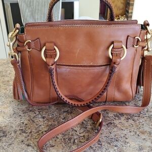 Elegant tan leather satchel. Features front buckle pocket. Gold-tone hardware. Perfect for everyday use.