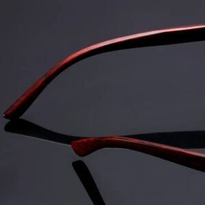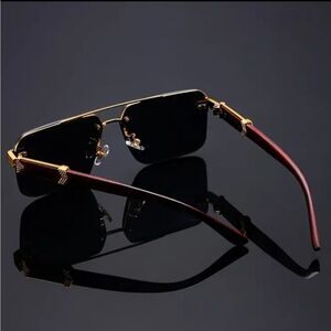 These sophisticated sunglasses feature a rimless bottom design with a gold-tone metal frame and dark black lenses. The wooden temple arms add a touch of elegance, making them a luxurious accessory for any occasion.
