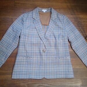 Stylish plaid blazer. Features classic lapel. Perfect for layering.