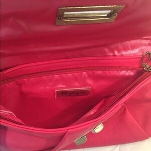 Miztique pink crossbody with silver chain and pink patent details. Double Turnlock closure. Approximately 12 inches wide and 7 inches wide.