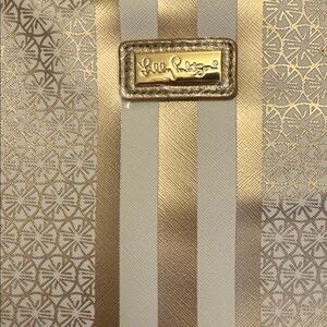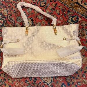 Chic tote by Lilly Pulitzer. Features a gold geometric pattern on cream. Perfect for stylish outings.