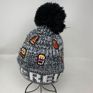 So fun! Pizza, hot dogs, hamburgers on a fabulous pill on beanie with large Pom Pom and #crew.