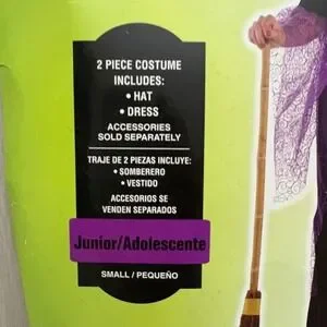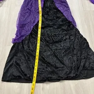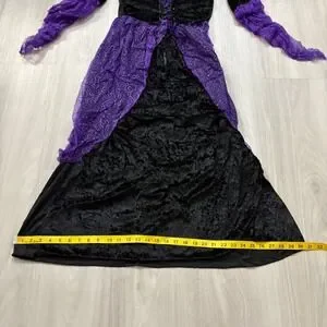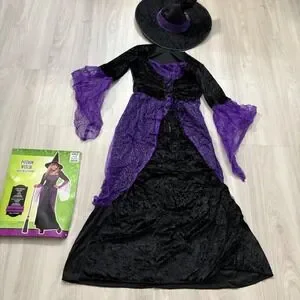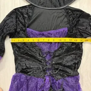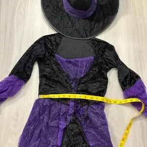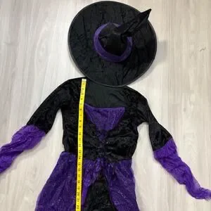 Keywords: witch costume, halloween costume, girls costume, kids costume, potion witch, costume with hat, dress up, halloween outfit, purple and black costume, cosplay, junior size, small costume, dress and hat set, halloween party