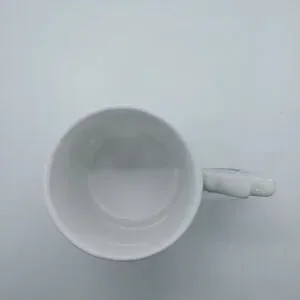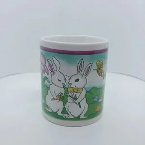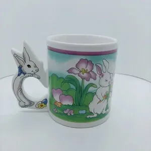 Mug features a pristine Easter scene with bunnies, flowers, and foliage with a handle in a bunny shape.