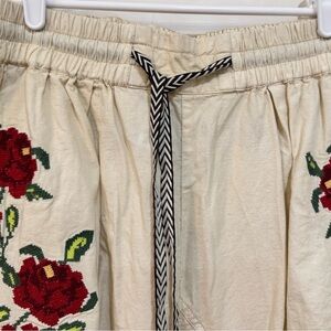 Cream wide leg pants with red floral embroidery. Elastic waistband with drawstring. Comfortable and stylish.