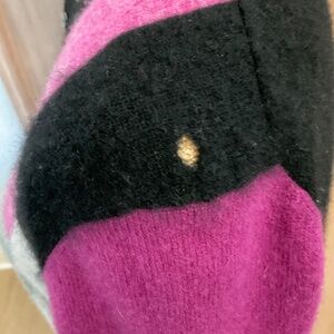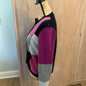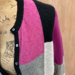 100% 2 ply cashmere cardigan with pink purple black and gray color blocking.