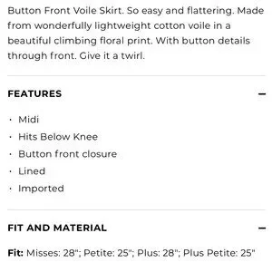 New without tags. Buttons all the way down. Adjustable belt. Elastic in back. Fully lined. Hand pockets! Waist is 16 1/2” across. 28 1/2” long.