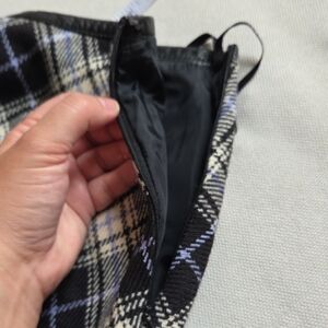 Hello! This listing is for a beautiful wool skirt by Anne Klien. Made in the Philippines. The plaid is virgin wool and the lining is polyester. Skirt has a black leather trim on the top. Zipper with clip for fastening on the side.