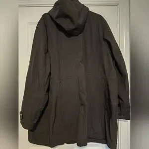 Chic black water resistant jacket by Michael Kors. Features stylish gold zippers and buttons. Warm plush lining. Ideal for versatile wear.