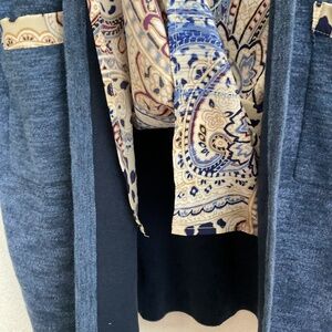 Elevate your wardrobe with this fun and fashionable cardigan from Chico's! This sweater features a bold mixed-print design that beautifully combines a classic paisley motif with trendy leopard spots in shades of blue, black, and neutral tones.