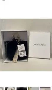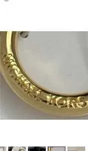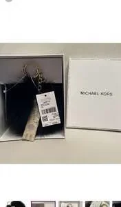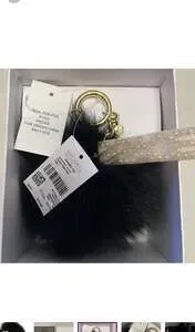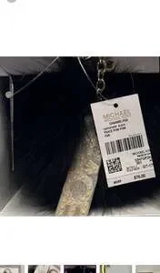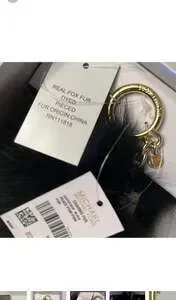 Michael Kors Peace Pom Pom Keychain, a stylish accessory to personalize your bag or keys. This features a luxurious black fox fur pom pom and a gold-tone 'PEACE' charm, adding a touch of elegance. While the images show a tag for 'Michael Kors Large Black