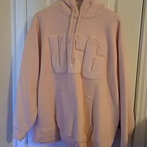 Cozy UGG hoodie in soft pink. Features plush logo and front pocket. Ideal for casual wear.