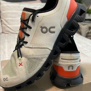 On Cloud X 3 running shoes in white with black accents. Perfect for athletic activities.