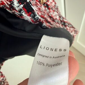 Elevate your outfit with this statement Lioness cropped tweed blazer, designed in Australia. The classic red, black, and white plaid pattern gives a timeless, Chanel-inspired look — perfect for fall and winter layering. Features gold-tone double-breasted buttons, structured shoulders, and full black lining for a polished fit. Dress it up with leather pants or down with denim for a chic, confident vibe.