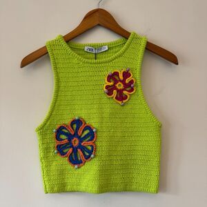 NWT Zara Lime Green Crochet Crop Tank Top Floral Embroidery M