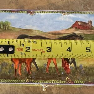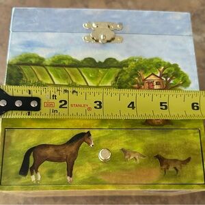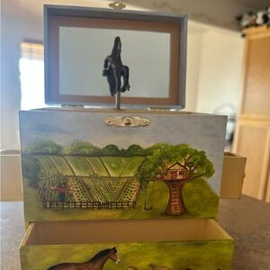 Elegant children’s musical jewelry box featuring a horse figurine and mirror. Perfect for storing accessories. Multiple drawers.