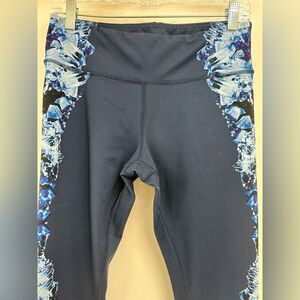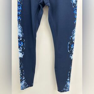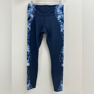 Alo Yoga Airbrush Leggings in Dark Crystal. Navy blue with lighter blue crystal print up sides of legs. Size medium. Approximate measurements: inseam 28, waist 14, rise 9