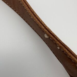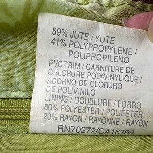 Liz Claiborne Brown Woven Material Shoulder Bag with Faux Leather Trim; Single open compartment with zippered top closure; 3 slide pockets, 1 zippered side pocket, and card slots within a green floral interior lining; Measures 12.5" wide, 11" height, 6" depth, and 9' drop from top center of strap to top of bag; Slight loose threads on strap (shown in picture) and removable wooden monkey accent broken (shown in pictures)