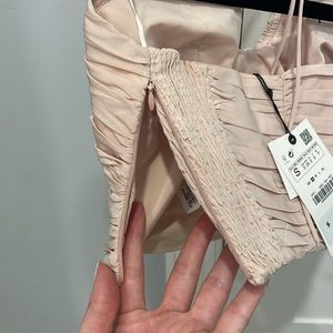 Stylish ruched crop top. Soft pink hue. Perfect for casual outings.