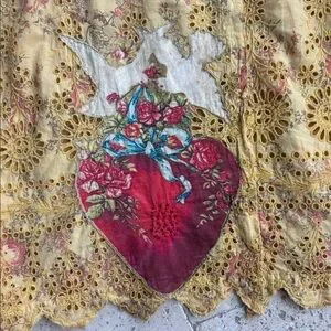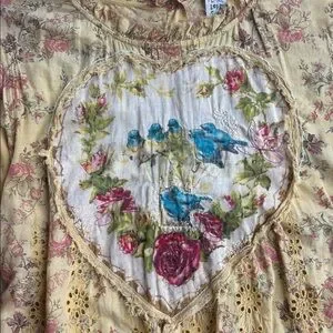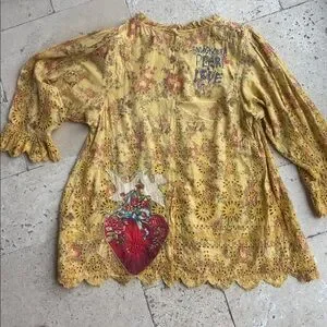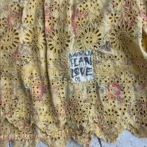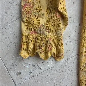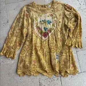Beautiful Magnolia Pearl yellow blouse with floral embroidery. Features intricate lace details and vibrant colors. Snap Buttons all down the back.