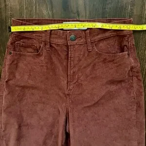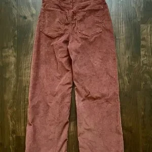 The product is a pair of Old Navy corduroy pants in a sky-high wide leg style, in a vibrant amber brick red color. These size 6 pants feature a high rise waist with a zip and button closure, making them suitable for travel, casual wear, and workwear. Made from a blend of spandex, rayon, viscose, and cotton, these pants are easy to care for and have pockets for added convenience. Perfect for all seasons, these pants offer a regular fit and a 26-inch inseam. Worn once, like new!
