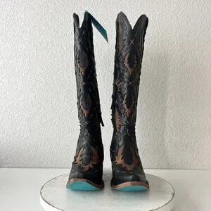 Lane Reverie Knee High Womens Cowboy Boots in Jet Black and Burnt Caramel Brown Leather Inlay featuring a corset closure in the back.