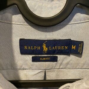 Classic Ralph Lauren button-down shirt. Light gray color. Perfect for casual wear.