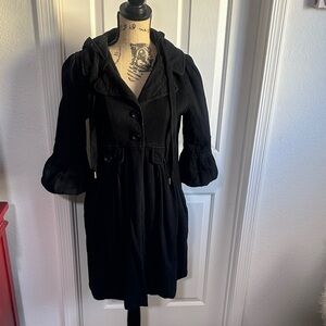 Chic black trench coat with stylish design. Features button closure and hood. Ideal for versatile wear.