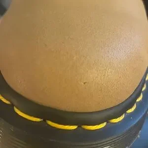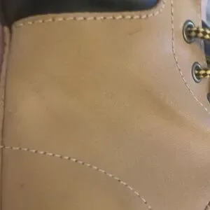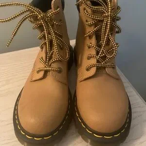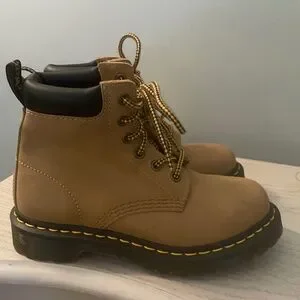 The Dr. Martens 939 Air Ware RARE Construction Boots in size 5 for women feature a 9.5" sole. With a round toe shape, lace-up closure, and low heel height, these boots offer comfort and slip-resistance. The beige color & dark brown features with block heel style add a stylish touch to the durable leather upper material. Perfect for winter, fall, and spring seasons.
