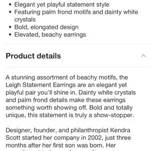 A stunning assortment of beachy motifs, the Leigh Statement Earrings are an elegant yet playful pair you'll shine in. Dainty white crystals and palm frond details make these earrings something worth showing off. Bold and totally unique, this statement is truly a show-stopper.