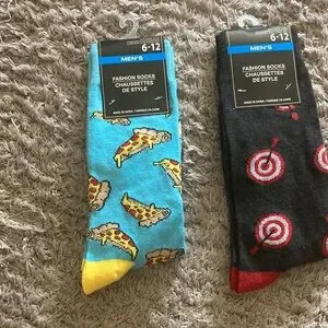 Add a playful touch to your wardrobe with these men's fashion socks. Featuring a fun pizza design on a vibrant blue background and a target design on a sleek black background, these socks are perfect for casual wear. Comfortable and stylish, they are a must-have for any sock collection.