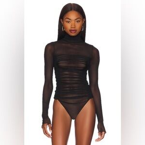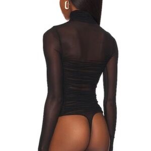 Description: Sheer perfection, this stunning bodysuit is featured in a sheer mesh fabrication with gathered detailing at the bodice and turtleneck silhouette for your newest go-to layering piece.