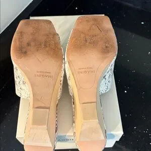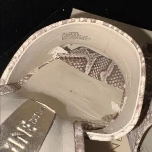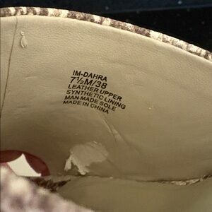 IMAGINE Vince Camuto light wood tone wedges with a white and gold snake print "moleskin" like upper. NOTE that official color says "white gold snake print" but it seems more like snake print of taupe brown shades with an understated gold shimmer over the whole upper.