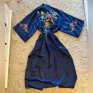 Elegant vintage Golden Dragon robe made of 100% pure silk with stunning hand-embroidered floral details. Deep navy blue with a matching tie belt. Lightweight and luxurious — perfect for lounging or as a statement layering piece.