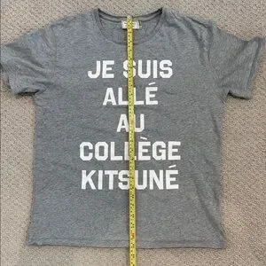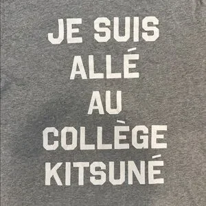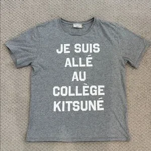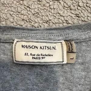 Heather gray tee with Maison Kitsune label. Soft and stylish.