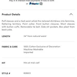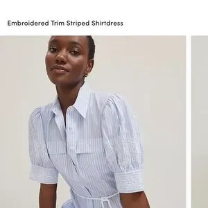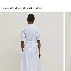 New with tags. Ann Taylor Embroidered Puff Sleeve Blue Striped Midi Midaxi Shirtdress Shirt Dress size 0. Puff sleeves and a tied waist whisk this tailored shirtdress into feminine, flattering territory. 100% cotton. Point collar. Front button closures. Short sleeves with button cuffs. Removable tie belt. Side slit pockets. Box pleat from back yoke.
