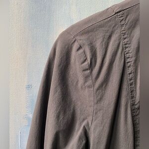 This is a stylish and comfortable military-inspired jacket from the brand XCVI. It features a full-zip front closure with a mock neck collar and decorative button details down the front. The jacket is a brown/dark gray color and has two functional front pockets. It is a lightweight, casual jacket perfect for layering. The brand is known for creating comfortable, wearable clothing.