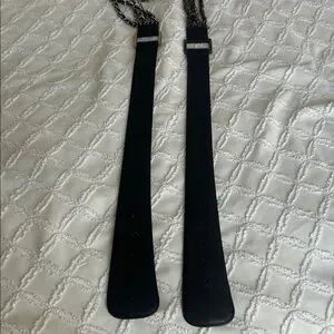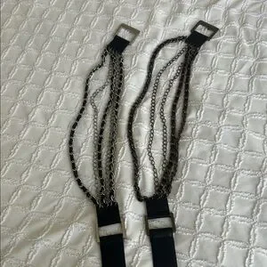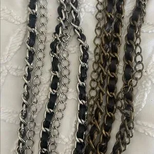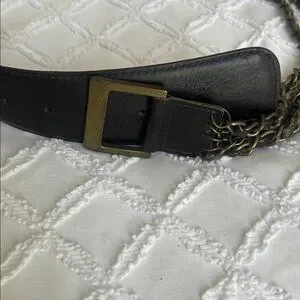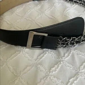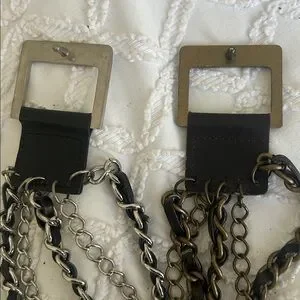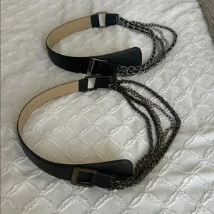 Stylish black leather belt featuring chain detail. Perfect for adding an edgy touch to any outfit. Two belts silver and bronze chains.