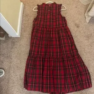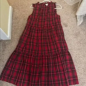 Chic J. Crew dress with a red and black plaid pattern. Ideal for holidays. Tiered. Midi length. EUC